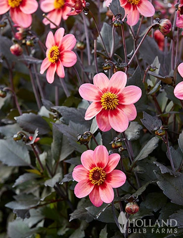 Dahlegria Tri-Colore Dahlia is sure to stand out in your garden with the dark purple foliage and orange/pink bloom. This unique dahlia would make a wonderful addition in any container or as a border plant in your garden bed.