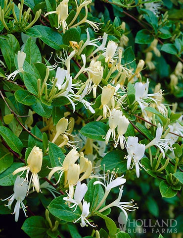 The Halliana Honeysuckle is one of the most widely grown varieties. This variety is very vigorous and bears multiple fragrant, pure white blooms from late Spring through late Summer. The blooms will gradually change to a pale yellow throughout the growing season. The Halliana Honeysuckle will need to grow on a trellis or fence to grow upright but can also be used as a groundcover on slopes or banks.