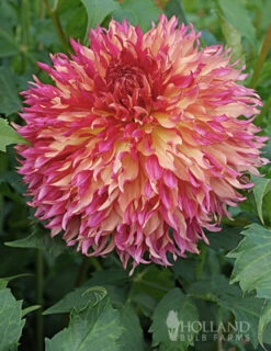 Narrow twisted petals of peach, pink and yellow. Huge flowers last long, and well into the fall months. Flowers can grow up to 8″ wide if the plants are trained properly. For the biggest blooms on your dinner plate dahlias, remove all side buds from the stem to encourage one main flower to form.