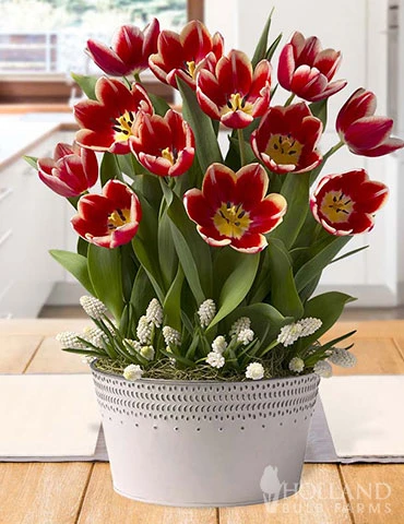 Brightly colored red tulips have a cool white edge on the petals just like your favorite peppermint candy! Add some pep to your holiday decorations with the Peppy Peppermint Potted Bulb Garden. It also makes a lovely gift to send to your loved ones near and far. Peppy Peppermint Potted Bulb Garden has everything needed to grow beautiful tulips in your home this winter, just add water.