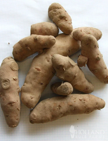 This fingerling is truly the classic of the bunch, maturing in 80-90 days. Its slender shape and rose-colored skin make it not only delicious, but also quite attractive. It bears distinct eyes as well as smooth and firm yellow flesh which is great when used as a flavored puree to thicken soups, sauces and gravies. Also makes a wonderful roasting potato!