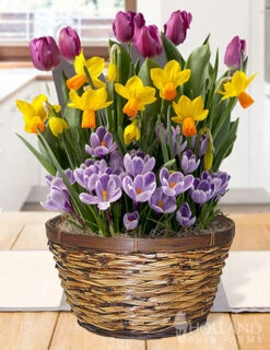 A trio of royal purple and yellow blooms will spring up from the Royalty potted bulb garden. Each Royalty Potted Bulb Garden contains: 6 King of the Striped Crocus, 6 Purple Prince Single Early Tulips and 5 Jetfire Daffodils, a true royal and vibrant garden delight. This potted bulb garden garden comes complete with a 8″ tan wicker pot with plastic lining, soil, & bulbs, for immediate growing.